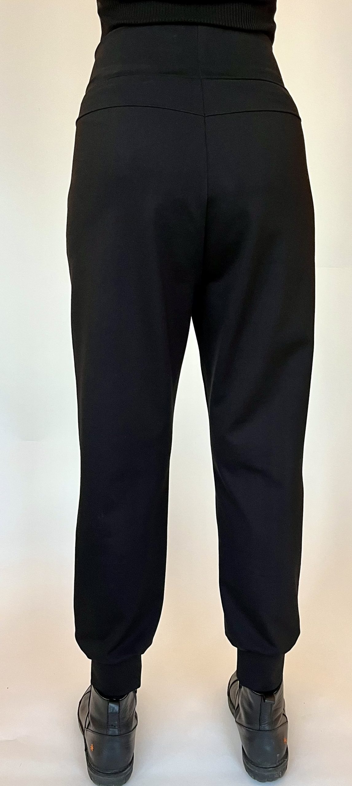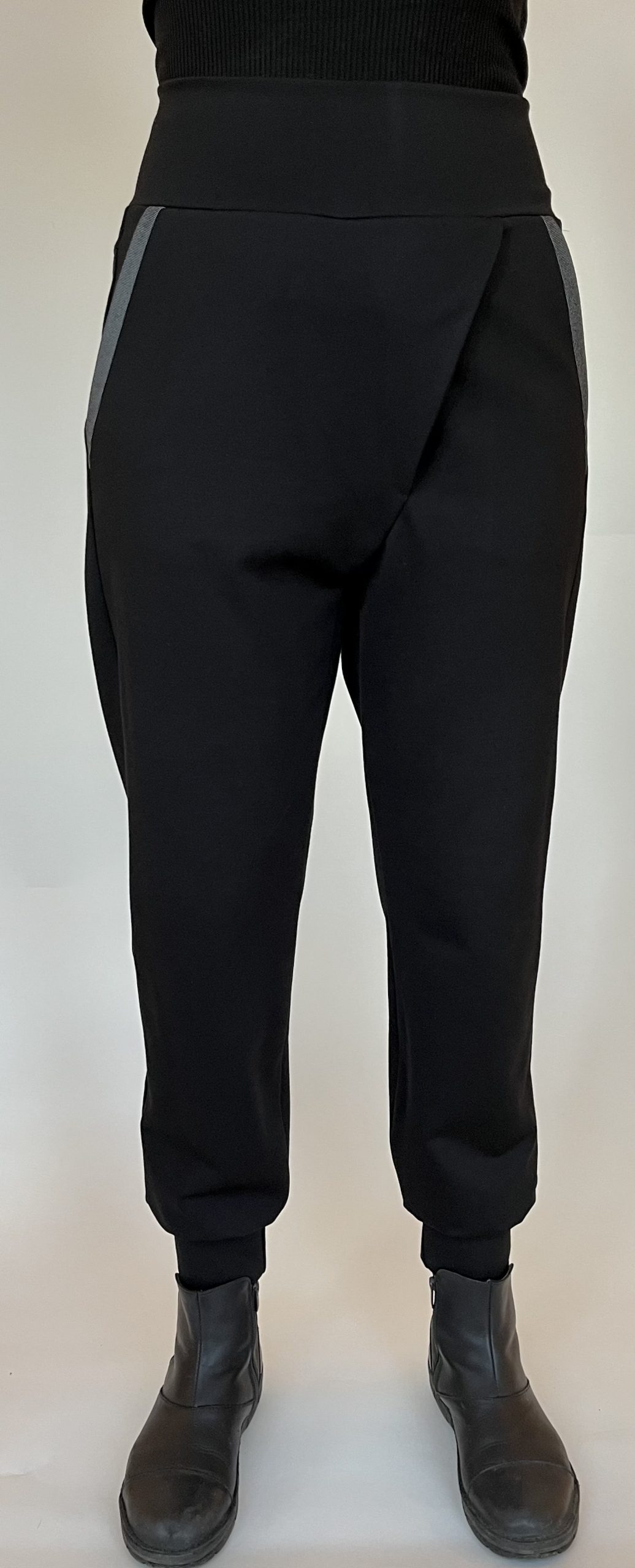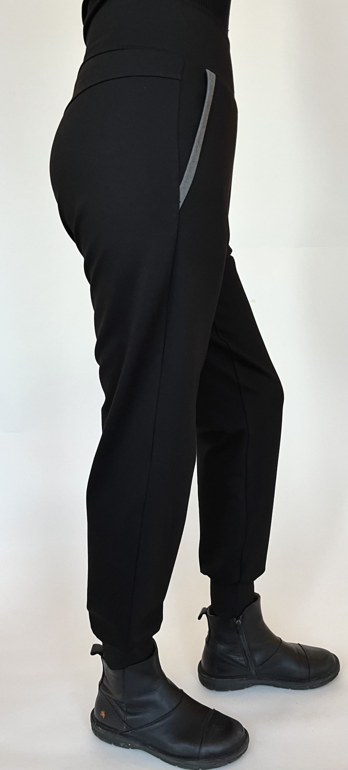 Lýsing: Töffaralegar buxur úr teygjanlegu efni, teknar saman að neðan með stroffi.